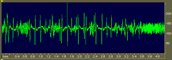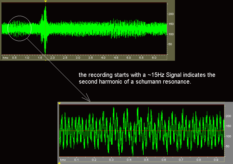 During the first recording session using the vertical field probe, some strong fundamental Schumann resonances overrides the humming backround. Due to the poor frequency response of my tape-recorder at the low end and the poblems to reproduce the 7.8Hz fundamental - the Schumann-Signal cannot shown itself. Instead the quenching of the humm indicates the pressents of a very strong VLF. The differential peaks of the changing polarity exceeds the 0dB output range of my tapedeck. I'm looking for a better equipment.